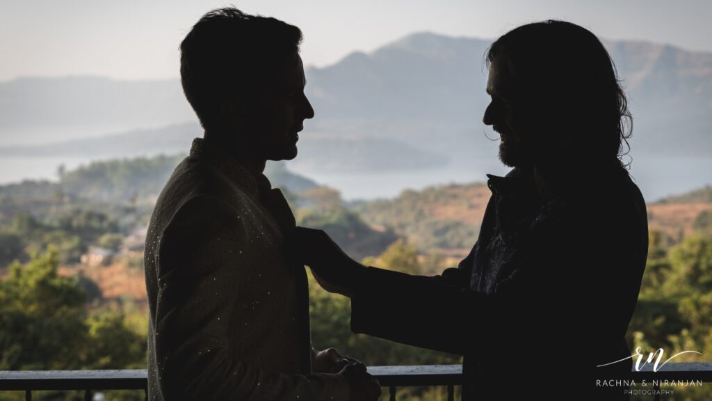 Nestled near Mulshi Dam, Malhar Machi offers a serene escape with misty mountains, earthy villas and lakeside calm. As photographers, we especially love the way the sunset casts a golden glow across the lake onto the mountains, offering a magical backdrop for couple portraits. Equally beautiful is the morning golden hour, when soft light filters through the trees. It was an ideal time and location to make some great portraits of Sunanda , Danilo & their families before the wedding day truly began. These quiet pockets of time allow for intimate, unhurried frames that feel as peaceful as the place itself!