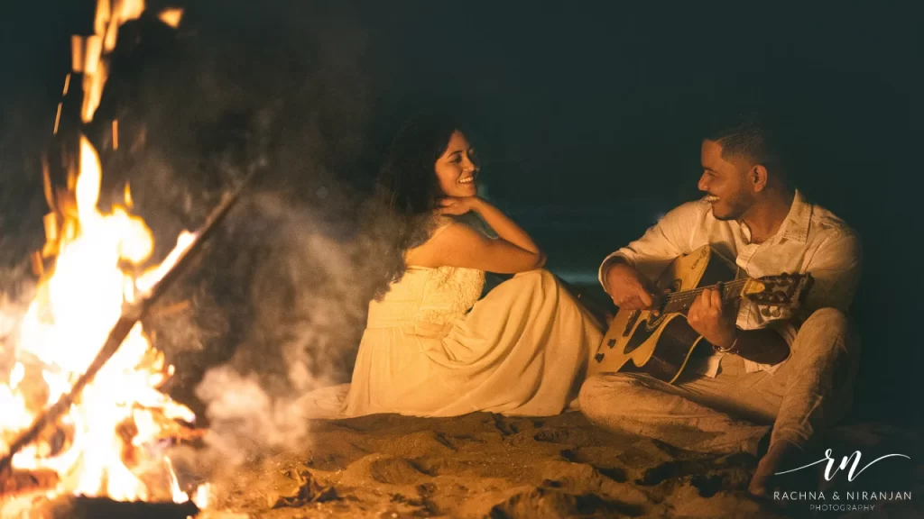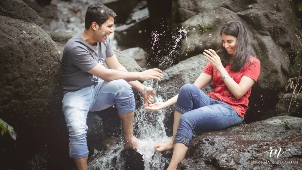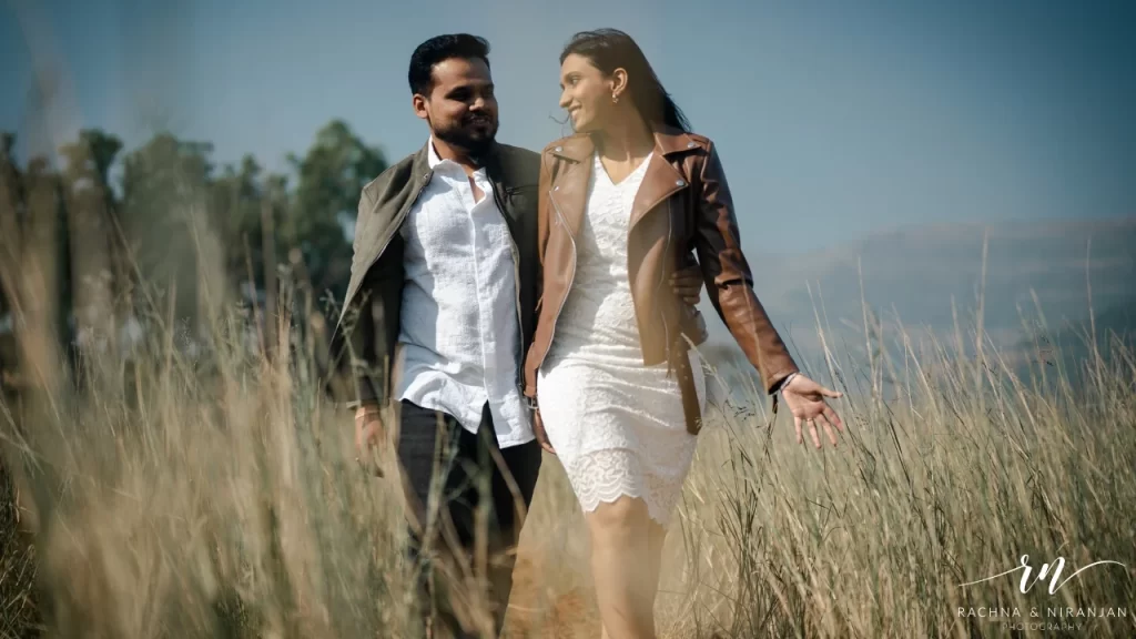 Think winding trails, dramatic cliffs, wind in your hair, and vast panoramic views. A mountain-side shoot is ideal for couples who bond over travel or nature. Whether it’s a trek to a waterfall or a drive to a hill station, the frames are always worth the effort.